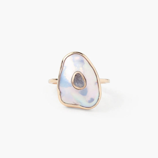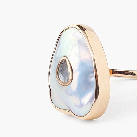 This 14k yellow gold oasis ring featuring a white irregular keshi pearl with a sliced diamond inlay. This piece is one of a kind so size and shape may vary.