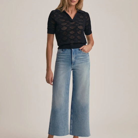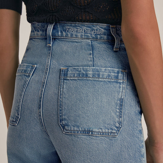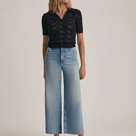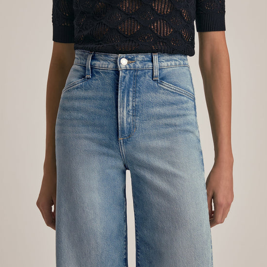 The relaxed wide leg, wide hem, 11.75" high-rise Mischa makes a statement in our best-selling Santa Barbara, a vintage medium-light wash crafted from comfort-stretch denim. It's designed to be pinched at the waist and fitted at the hips with 26.5" inseam for cut hems that hit above the ankle.