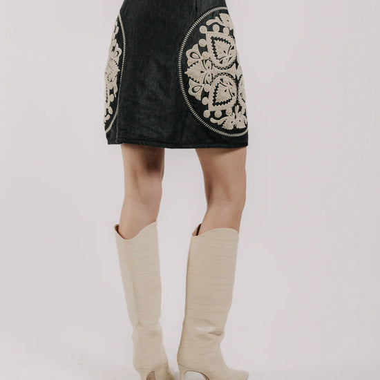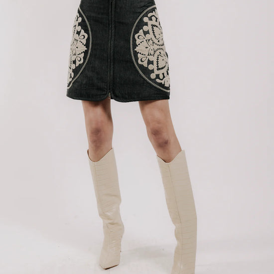 The Ayla Skirt is a standout piece featuring enlarged velvet ivory applique that adds a modern artisanal touch to a classic silhouette. With its front zip closure and flattering fit the Ayla Skirt transitions seamlessly from daywear to evening style.