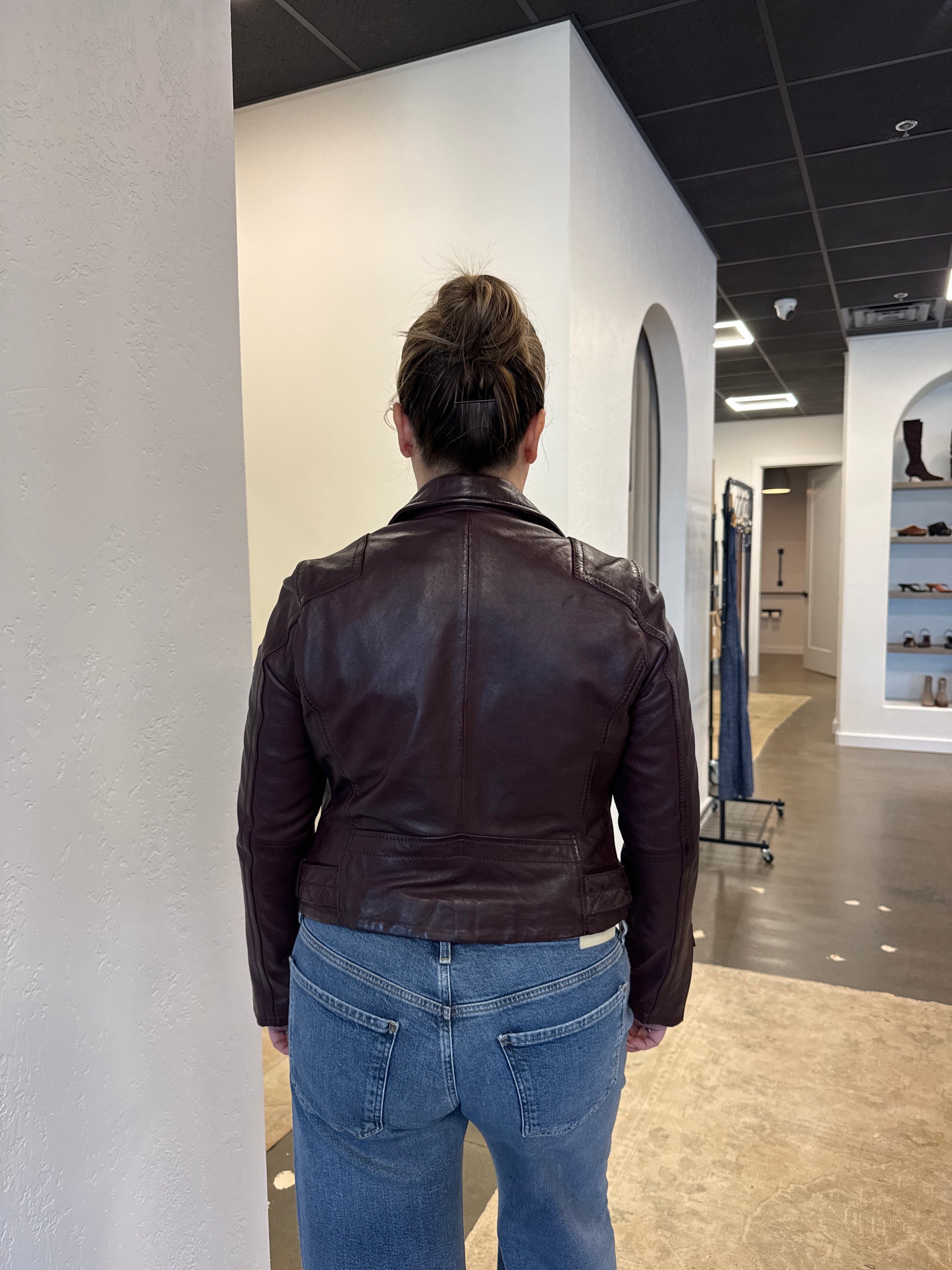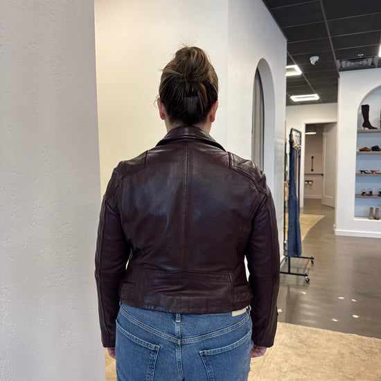 Crafted from 100% vegetable-tanned lambskin leather, this cropped jacket features clean lines and a sleek cross-zipper silhouette, elevated by distinctive shoulder and upper-back detailing and finished with a waist belt for a perfectly flattering shape.