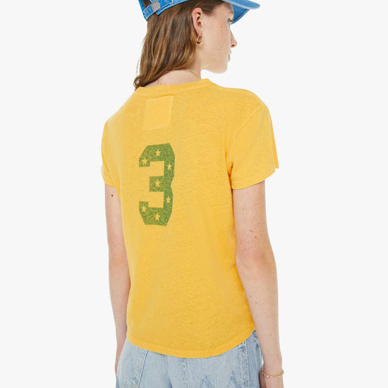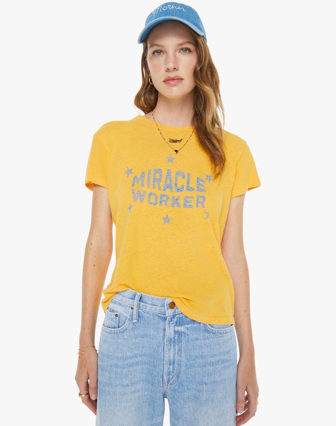 Against the odds. A soft crew neck with a slim fit for a vintage look and feel. Made from a SUPERIOR blend of cotton and linen in golden yellow, The Sinful in Miracle Worker features a faded blue text graphic and stars on the front.
