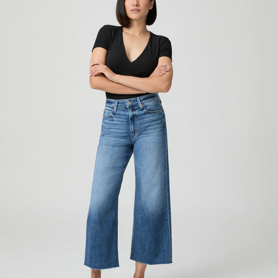 This modern high-waisted wide leg has an easy, relaxed fit and an ankle length silhouette. This style comes in a lived-in, medium blue wash with whiskering, fading, a raw hem and mixed metal hardware. Cut from our TRANSCEND VINTAGE denim, this effortlessly cool pair has the look of authentic vintage denim but is incredibly comfortable with plenty of stretch and recovery.