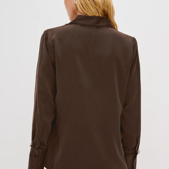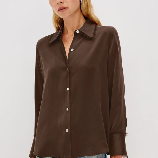 The Abbey is a silk charmeuse button-down with raw edge detailing at the collar and cuffs. It offers an easy fit with a touch of feminine flair.