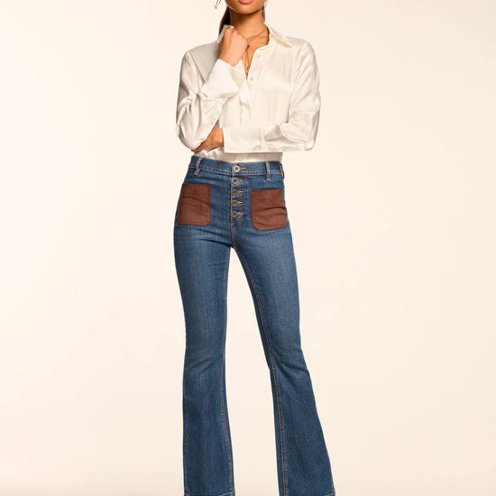 A fresh take on our signature Cindy silhouette, these high-rise flare jeans feature chic faux suede detailing for a subtle touch of texture. They sculpt and elongate with a five-button fly and flattering flare leg. The Cindy is endlessly versatile, this jean will bring a retro edge to your everyday wardrobe.