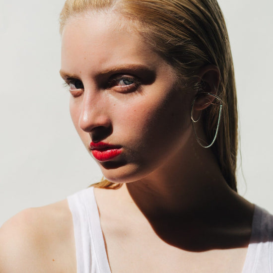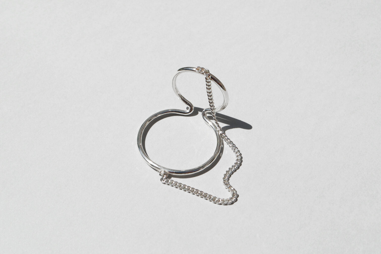 Two connected circles out of polished wire in recycled 925 Sterling silver, connected by a sparkling curb chain. No need to be pierced. One piece. Made in Munich.
